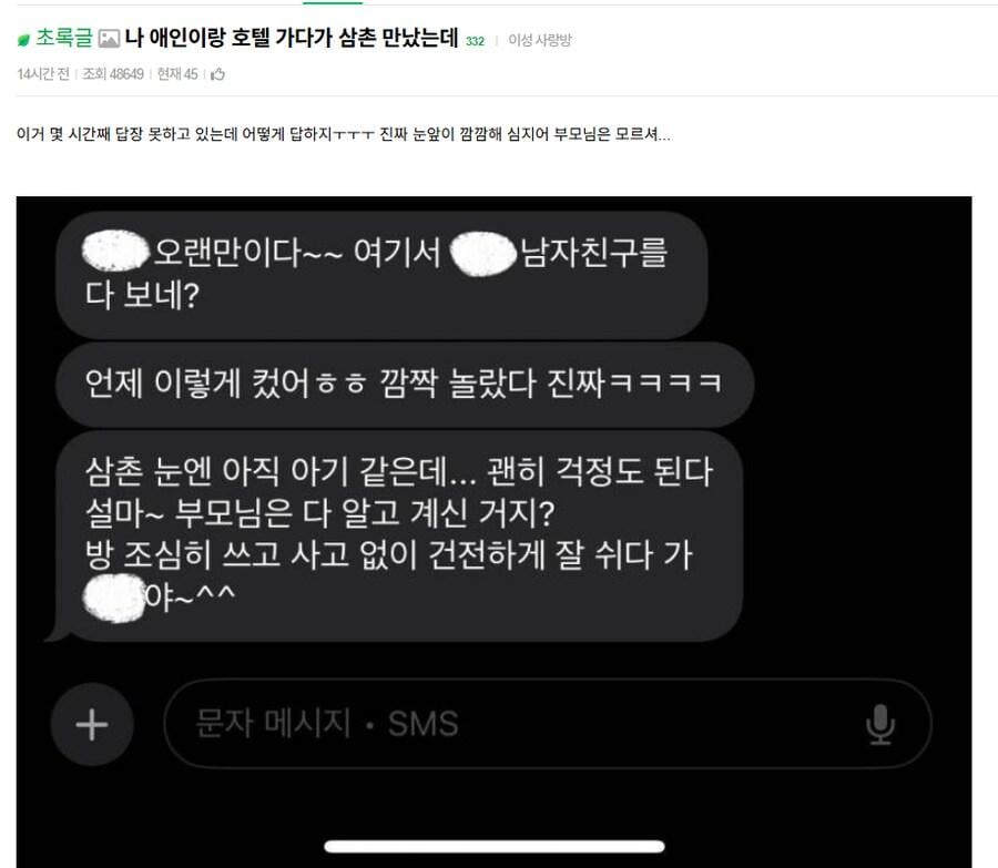 애인이랑 호텔 가다가 삼촌하고 만났는데.jpg rh1 0 97 0 2025.04.29 05:30 글쓴이 : 성인이니 애인이랑 호텔갈 수 있음삼촌 : 아직 21살 애기같은 조카니 걱정할 수 있음그냥 서로 안만났어야 되는데 ㅋㅋㅋㅋㅋ 0