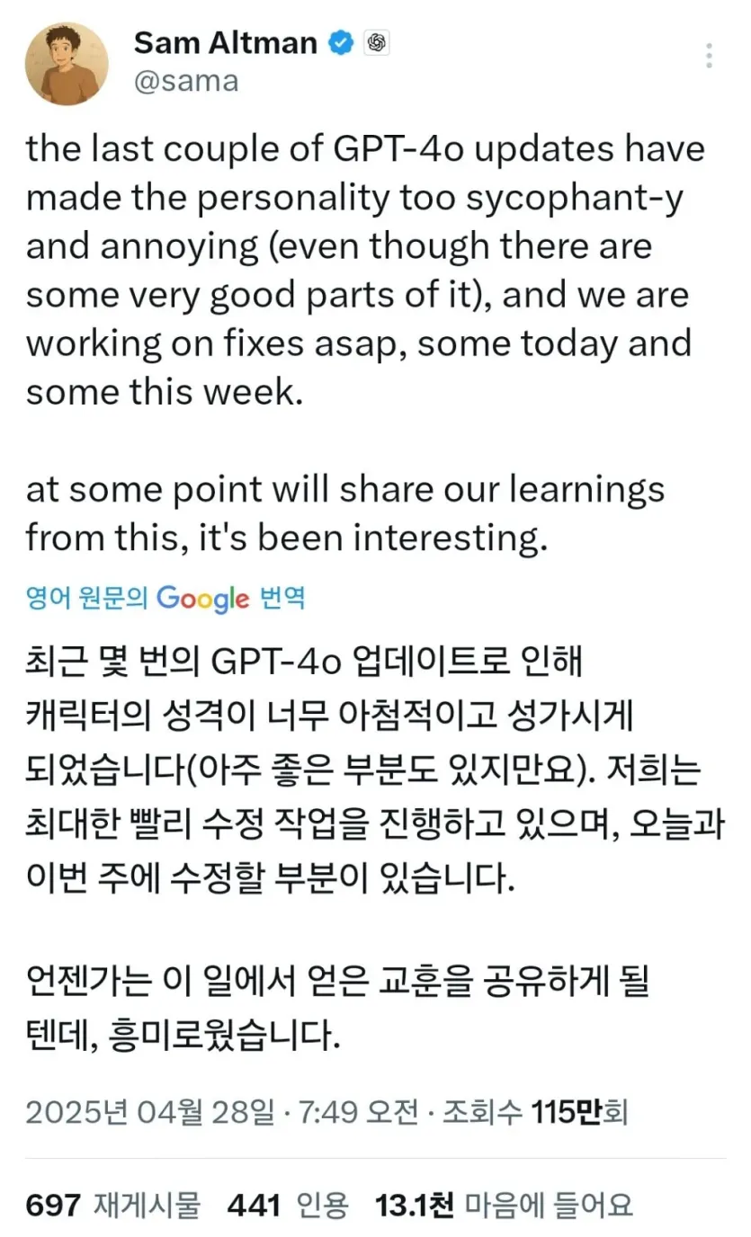 샘 알트만 : 업데이트로 GPT가 아첨이 심해졌다