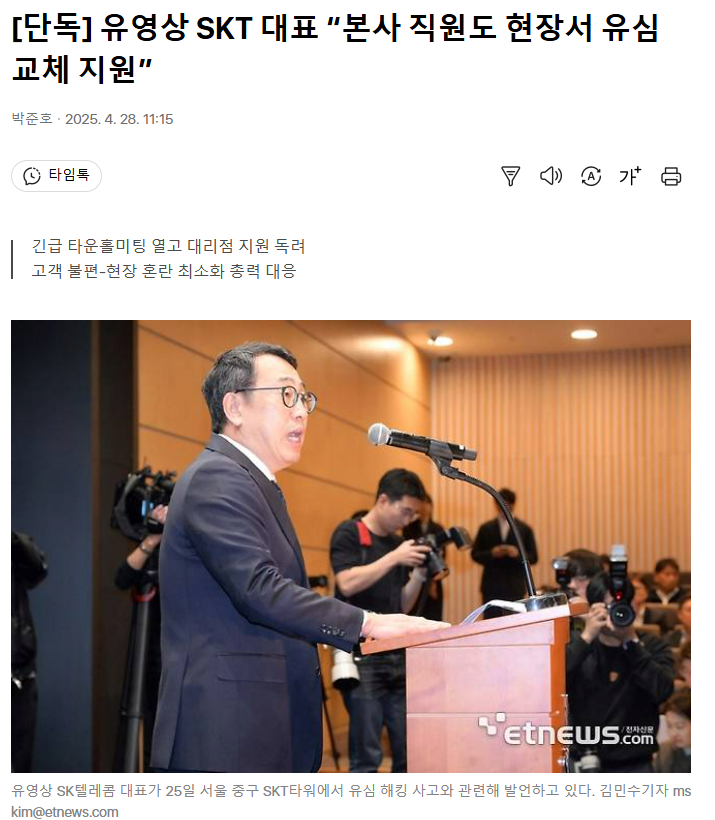 유영상 SKT 대표 “본사 직원도 현장서 유심 교체 지원” rh1 0 97 0 2025.04.28 15:15 물량이 없는데 유심 교체는 어케하나 잇섭 유튜브 나올때가 좋았지 유영상 SKT 대표 “본사 직원도 현장서 유심 교체 지원” 0