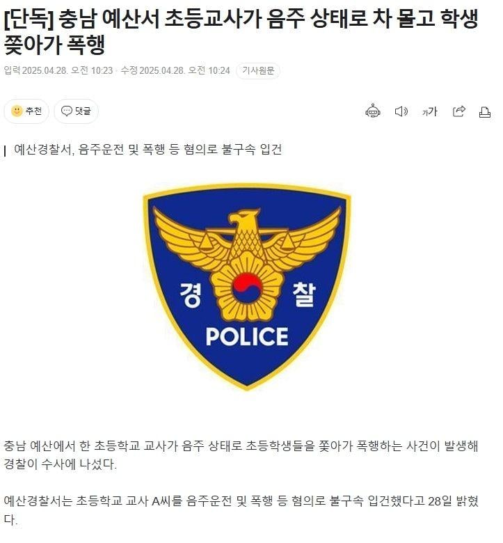 충남 예산서 초등교사가 음주 상태로 차 몰고 학생 쫒아가 폭행