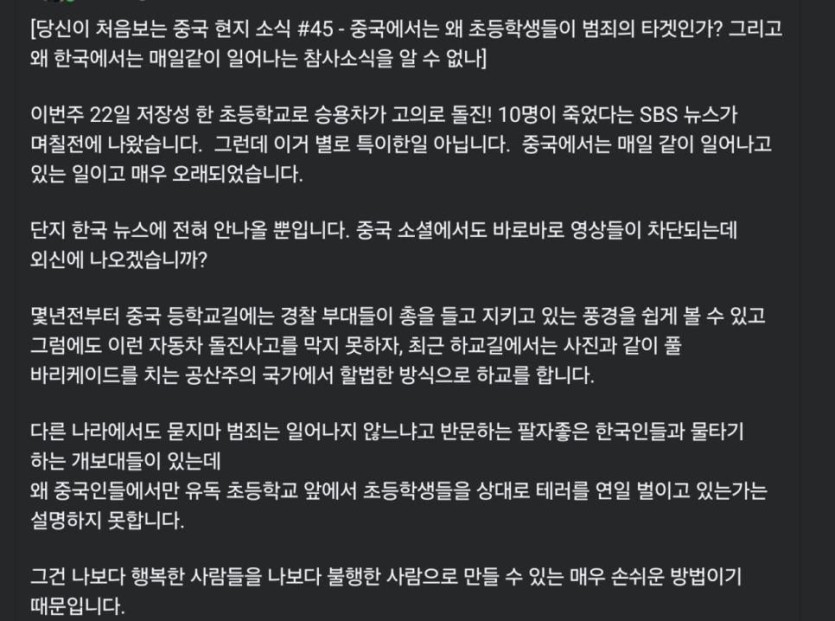 중국에서 급증하고 있는 어린이 살해 테러 rh1 0 202 0 2025.04.28 11:15 1. 중국에서는 초등학생 대상 범죄(테러)가 급증2. 유독 중국처럼 어린이를 겨냥한 범죄가 반복되는 이유는"행복한 사람을 불행하게 만드는" 쉬운 방법이기 때문3. 과거 1가구 1자녀 정책의 영향으로 아이 하나가 가문의 전부가 된 사회 구조에서 초등학생을 공격하면 그 가정 전체에 충격을 줄 수 있기 때문4. 중국에서는 언론통제로 잘 알려지지 않고 있고부유층이 사는 초등학교 등하교길은 공안들이 지키는중 0
