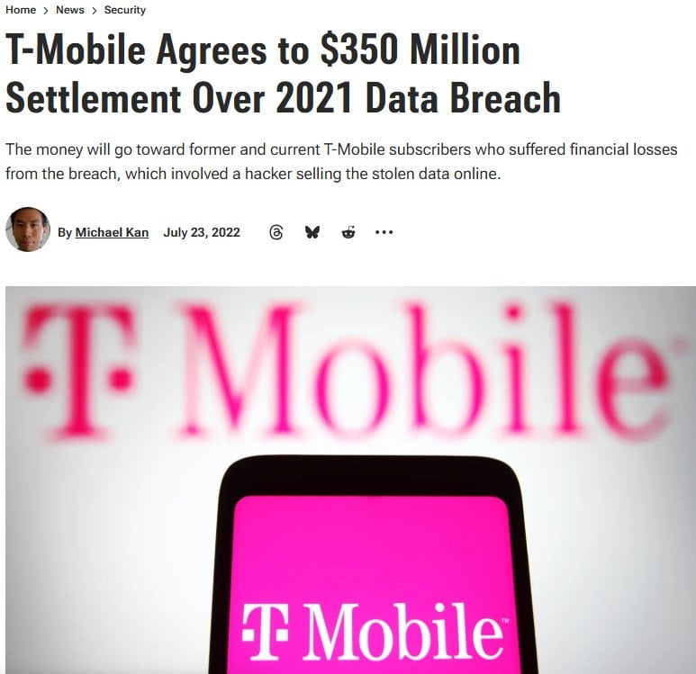2021년 T모바일(미국 통신사 점유율 2위)이 존 에린 빈스라는 해커에게 해킹당함 이에 T모바일은 조사 결과 사회보장번호(주민번호같은거),운전면허 등 민감한 개인정보가 유출되었다는 사실을 공표하면서 해킹된 고객들의 정보재설정과 2년간 무료보호서비스 등을 지원하겠다했지만 그걸로 성난 고객들의 집단소송을 막을 순 없었고...