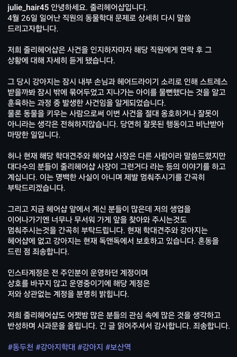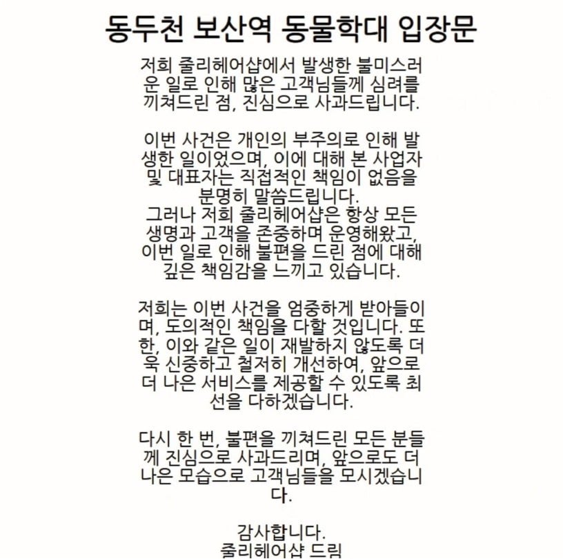 동두천 헤어샵 동물학대 논란 ㄷㄷ rh1 0 96 0 2025.04.27 16:15 사장 입장 : 강아지가 지나가는 아이를 물뻔해서 훈육하던 과정이었다 동두천 헤어샵 동물학대 논란 ㄷㄷ 0