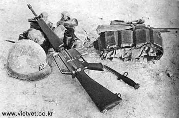 M16개인화기1. M16실탄300. M16탄창9. 탄띠. 탄창집. 대검. 철모, 모기약2개. 수통3개. 방탄조끼. 정글화. 베낭. 모포. 방독면. 야전삽. 판초우의.
