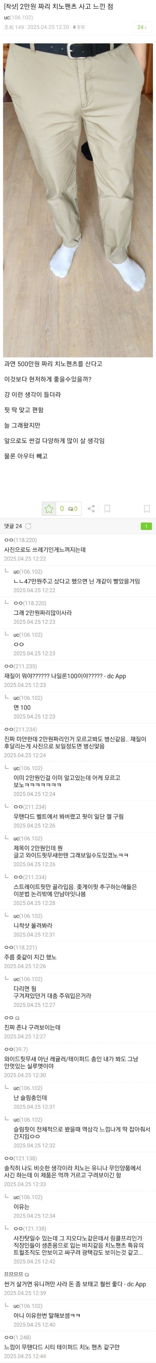2만원짜리 치노팬츠 착용 후기에 달린 악플들 rh1 0 96 0 2025.04.27 12:15 는 57만원짜리였구여참고로 어제자 패갤에 올라온 최신 디시만담임ㅋㅋㅋ 2만원짜리 치노팬츠 착용 후기에 달린 악플들 0