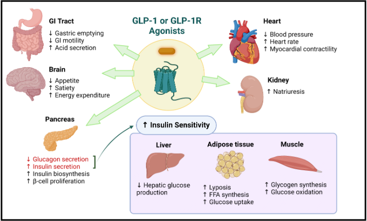 2. GLP-1 수용체 작용제는 뇌(시상하부)와 위에 작용해서 식욕을 떨어뜨리고 포만감을 일으킨다.