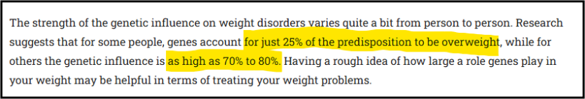 연구자마다 다르지만 비만에서 유전의 영향을 25%에서 80%까지 보고 있습니다.