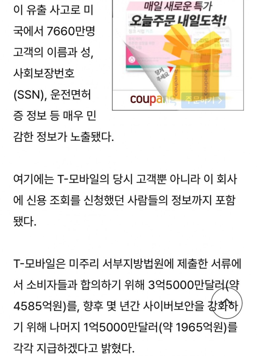미국 T-모바일, 개인정보 유출로 고객들에게 4585억원 지급 rh1 0 140 0 2025.04.26 18:15 2022년이긴한데 과연 한국은 얼마 배상하게 될까..? 미국 T-모바일, 개인정보 유출로 고객들에게 4585억원 지급 0