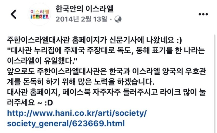 그리고 이스라엘이 2014년에 지리 교과서에 독도, 동해 표기를 했다는 말은 낭설이고, 이스라엘측이 한국 구글 지도를 링크로 걸었던 적은 있다. 그냥 한국 지도를 걸었을 수도 있지만, 이스라엘 나름의 배려일지도?