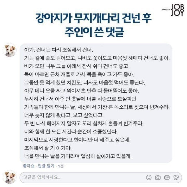 강아지가 무지개다리 건넌 후 주인이 쓴 댓글