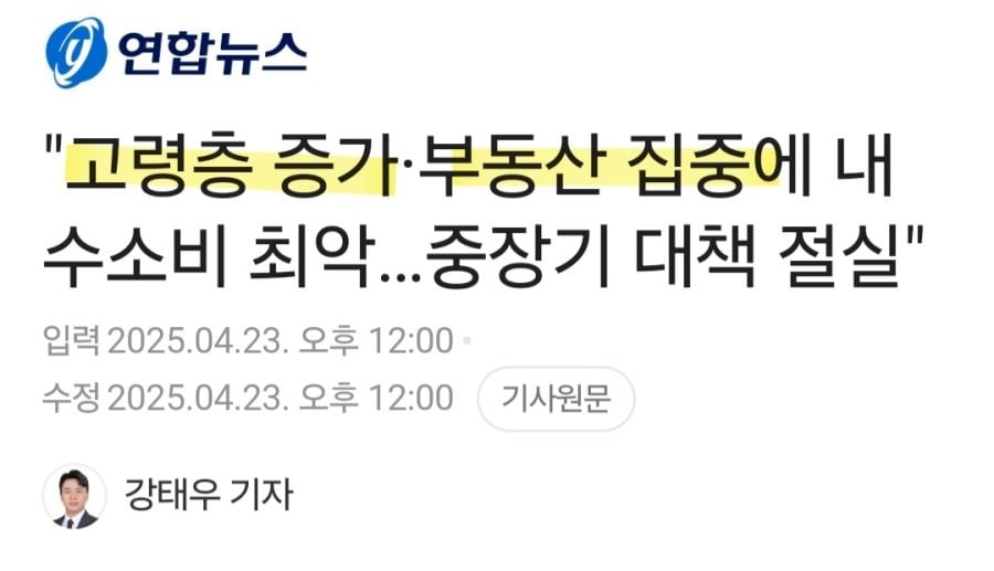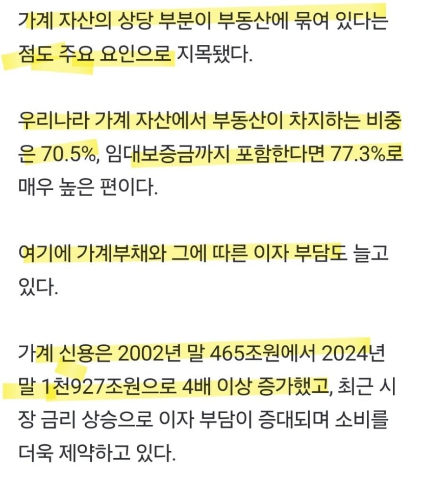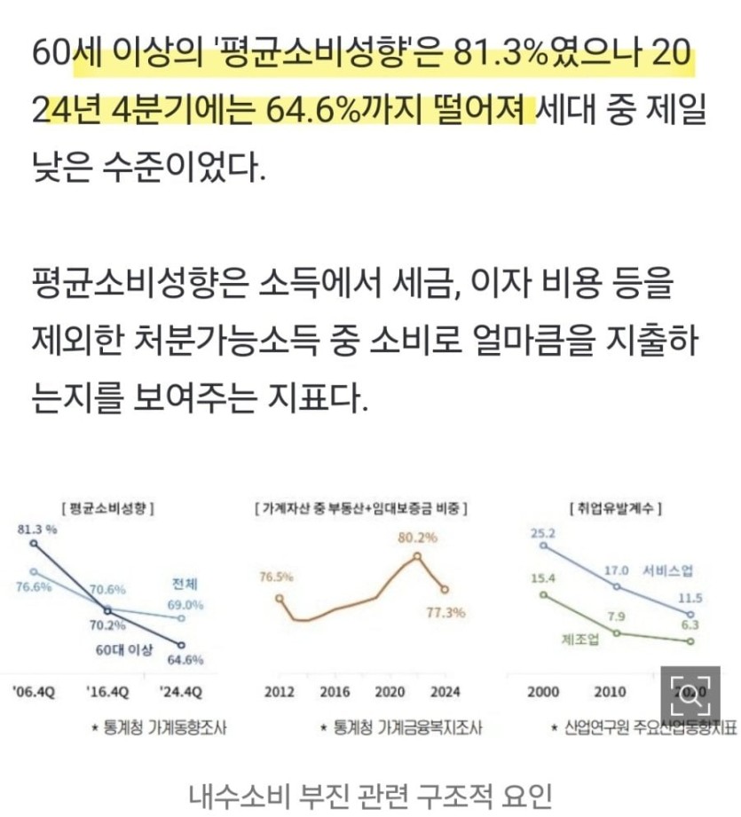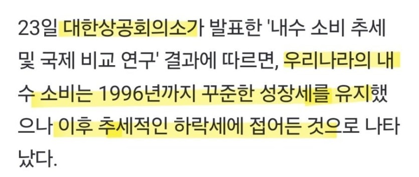 대한민국 내수가 최악인 정확한 이유 rh1 0 97 0 2025.04.26 10:15 (대한상공회의소 분석) 1996년까지는 내수소비가 증가세였으나, 1997년부터 내수소비가 중장기적 하락추세 가장 큰 이유는 1) 인구노령화로 소비가 급감 전체인구중 65세 이상이 7%에서 20% 까지 증가 노인들은 소비성향이 낮아서 소비를 안함 2) 가계자산의 부동산 집중 전체자산의 70% 이상이 부동산에 집중 (선진국 30%) 금리상승 등으로 가계부채가 4배 증가 거래 안되는 부동산 호가 하나 쥐고... 현금은 하나도 없는... 이자만 내고... 이러니, 소비가 폭망하는 구조 대한민국 내수가 최악인 정확한 이유 0