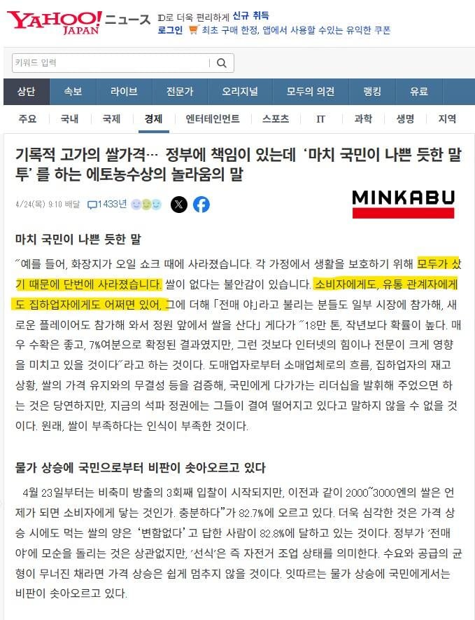 일본 농림수산부 장관 “쌀 대란은 국민 탓”.jpg