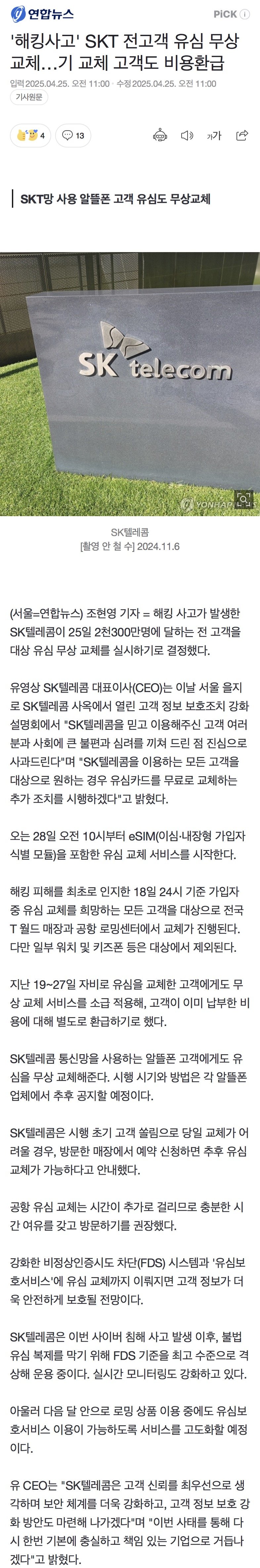SKT 전고객 유심 무상교체 ... 알뜰폰도 포함, 기교체자는 환급 rh1 0 97 0 2025.04.25 15:15 SKT 전고객 유심 무상교체 ... 알뜰폰도 포함, 기교체자는 환급 0