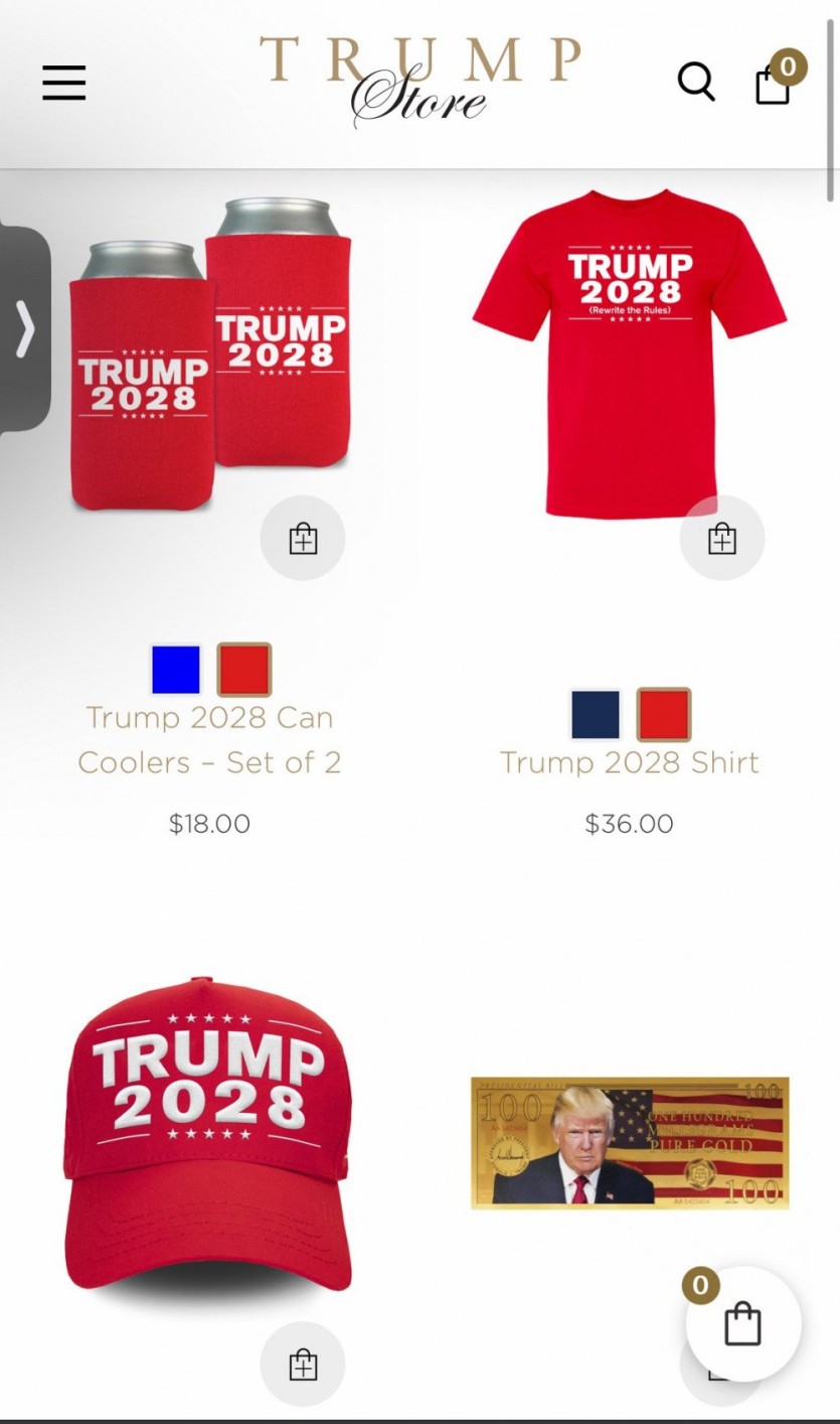 트럼프 공식 스토어에서 트럼프 2028 굿즈 판매 중