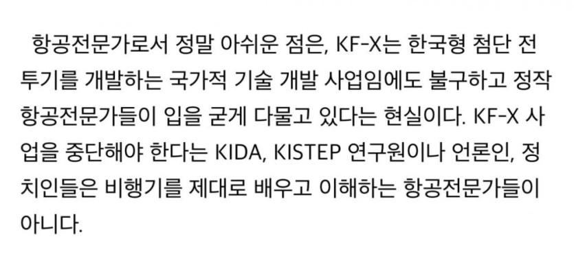 한국형 전투기 개발사업이 진짜 엄청난 업적인 이유 rh1 0 98 0 2025.04.25 13:15 시작부터 반대 쏟아지고좌우,여야 가리지 않고 반대국민 절반 이상 반대에다가 지지 연령층은 60대 뿐당장 재검토해야 된다는 의견이 주류항공전문가 아닌 연구원,언론인 다 나와서 욕함주류 댓글 반응 ㄷㄷ20년 동안 거의 모든 집단에서 반대여론 나왔는데 뚫고 성공함 한국형 전투기 개발사업이 진짜 엄청난 업적인 이유 0