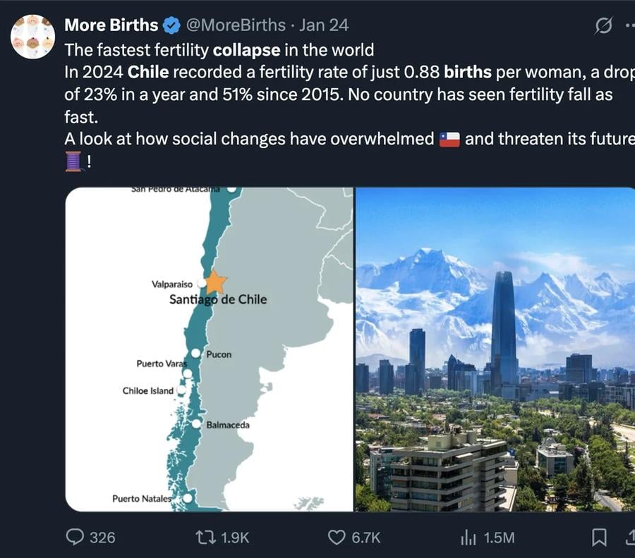 칠레는 전세계 2위의 저출산국가가 되었다. rh1 0 295 0 2025.04.25 09:15 전세계에서 가장 빠른 출산 폭락을 경험하는 중인 칠레2024년의 출산율은 0.882015년대비 반토막이 났음어떤 나라도 이정도로 빠른 각도로 출산율이 떨어지지 않았음대한민국보다도 더 빠름칠레의 특징은- 남미에서 꽤 잘사는 나라- 남미에서 수도권 집중이 가장 심한 나라 0