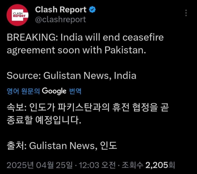 인도가 파키스탄과의 휴전협정 파기 rh1 0 95 0 2025.04.25 03:30 인도가 휴전을 파기하고 카슈미르 쪽으로병력을 이동중이라고 합니다파키스탄도 병력 이동중세계가 난리네요 0