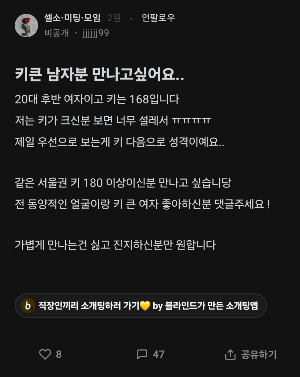 키 180cm 넘는 남자 만나고 싶다는 블라녀 rh1 0 156 0 2025.04.24 23:15 현차햄 완전 웃기네 ㅋㅋㅋㅋㅋㅋㅋㅋㅋㅋㅋㅋㅋㅋ 키 180cm 넘는 남자 만나고 싶다는 블라녀 0