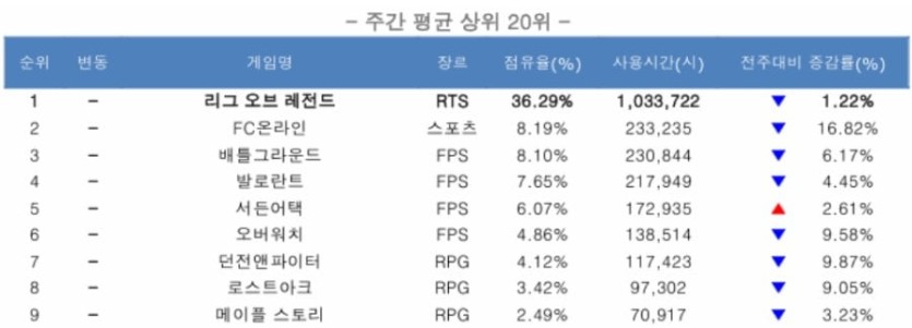 'LOL 망한다' 4월 PC방 게임 점유율 순위 rh1 0 141 0 2025.04.24 23:15 롤이 망해가는게 아니라 pc온라인 게임이 망해가는 듯 ㅎㅎ 롤 점유율은 10년전이나 지금이나 비슷 'LOL 망한다' 4월 PC방 게임 점유율 순위 0