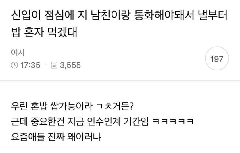 신입이 점심에 지 남친이랑 통화해야돼서 낼부터 밥 혼자 먹겠대.jpg