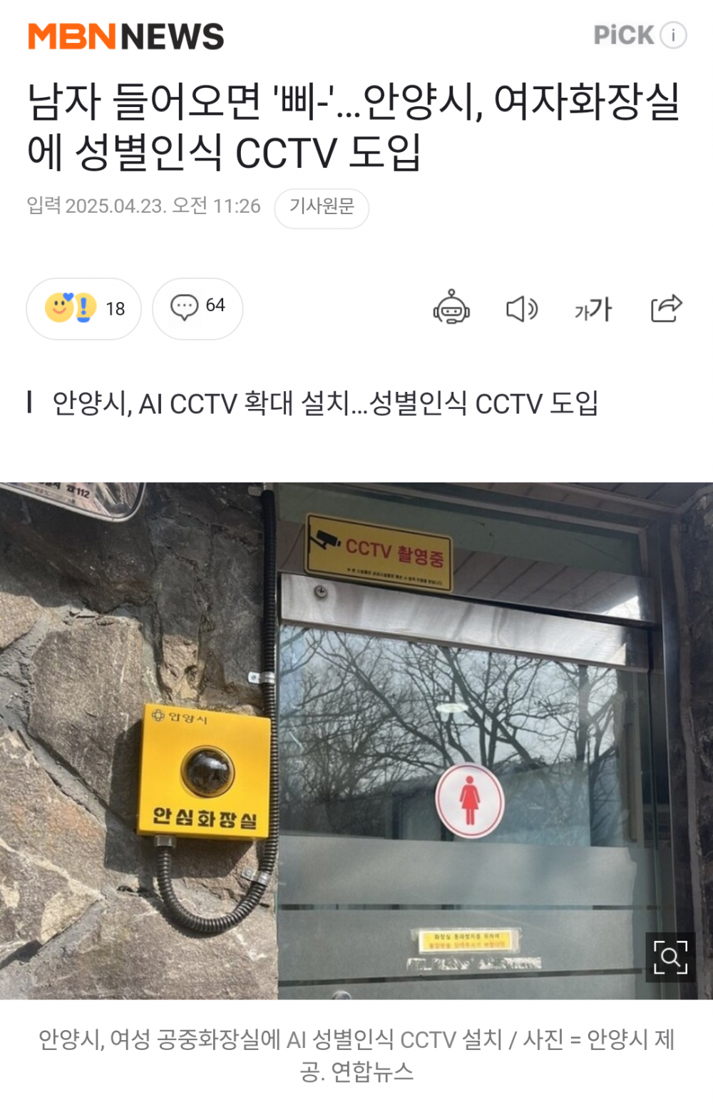 싱글벙글 여성스러워야 들어갈수 있는 화장실 rh1 0 119 0 2025.04.24 00:15 성별 인식 ai탑재 cctv가 출입자 성별을 확인하고 여자가 아닌거같다고 판단되면 경보가 울림 싱글벙글 여성스러워야 들어갈수 있는 화장실 0
