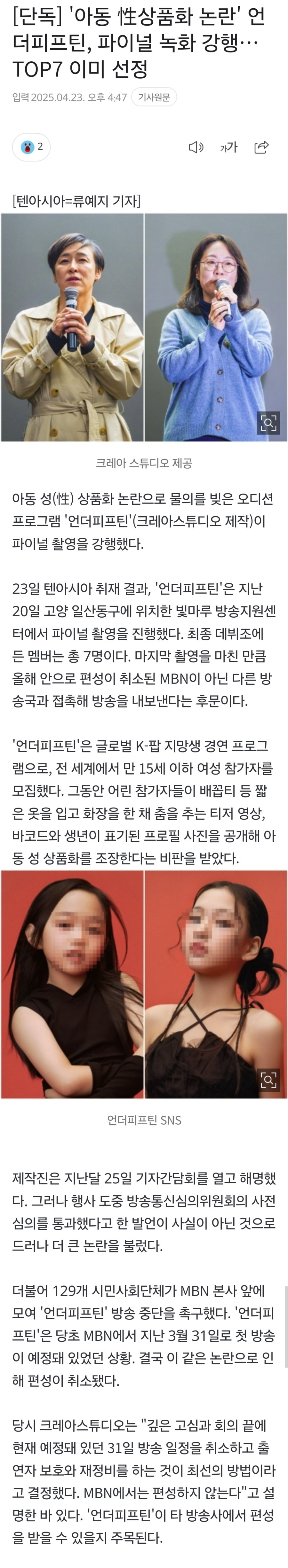 '아동 상품화 논란' 언더피프틴, 파이널 녹화 강행