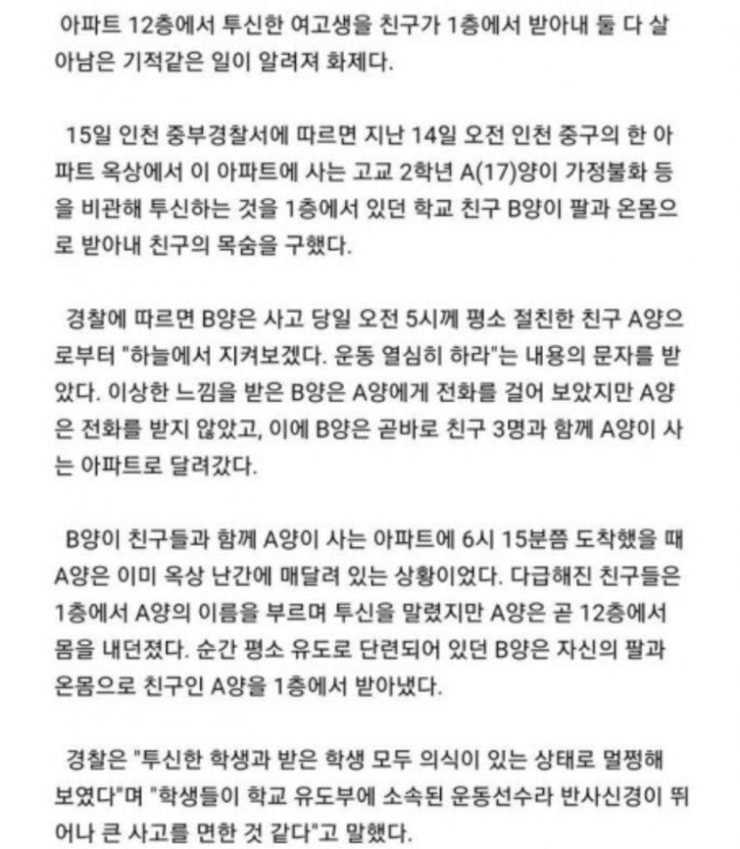 12층에서 투신자살한 여고생, 1층에서 받아내 구한 친구