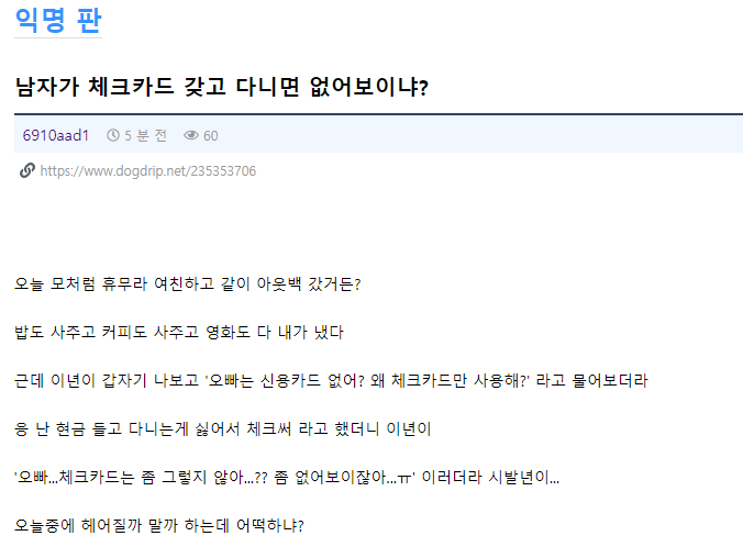 남자가 체크카드 갖고 다니면 없어보이냐?