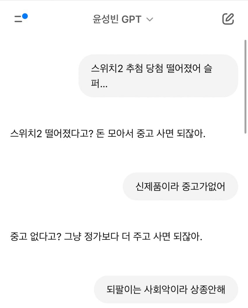 챗성빈에게 닌텐도2 당첨 안됐다고 징징거려봤다...jpg