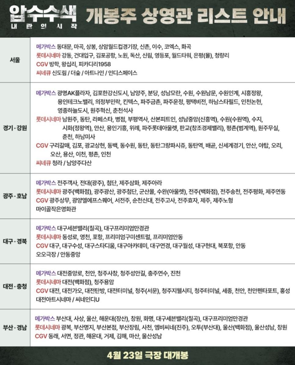 23일 개봉 <압수수색> 첫 주 개봉관 목록.jpg rh1 0 115 0 2025.04.23 15:00 https://x.com/newstapa/status/1914246563045528012 0