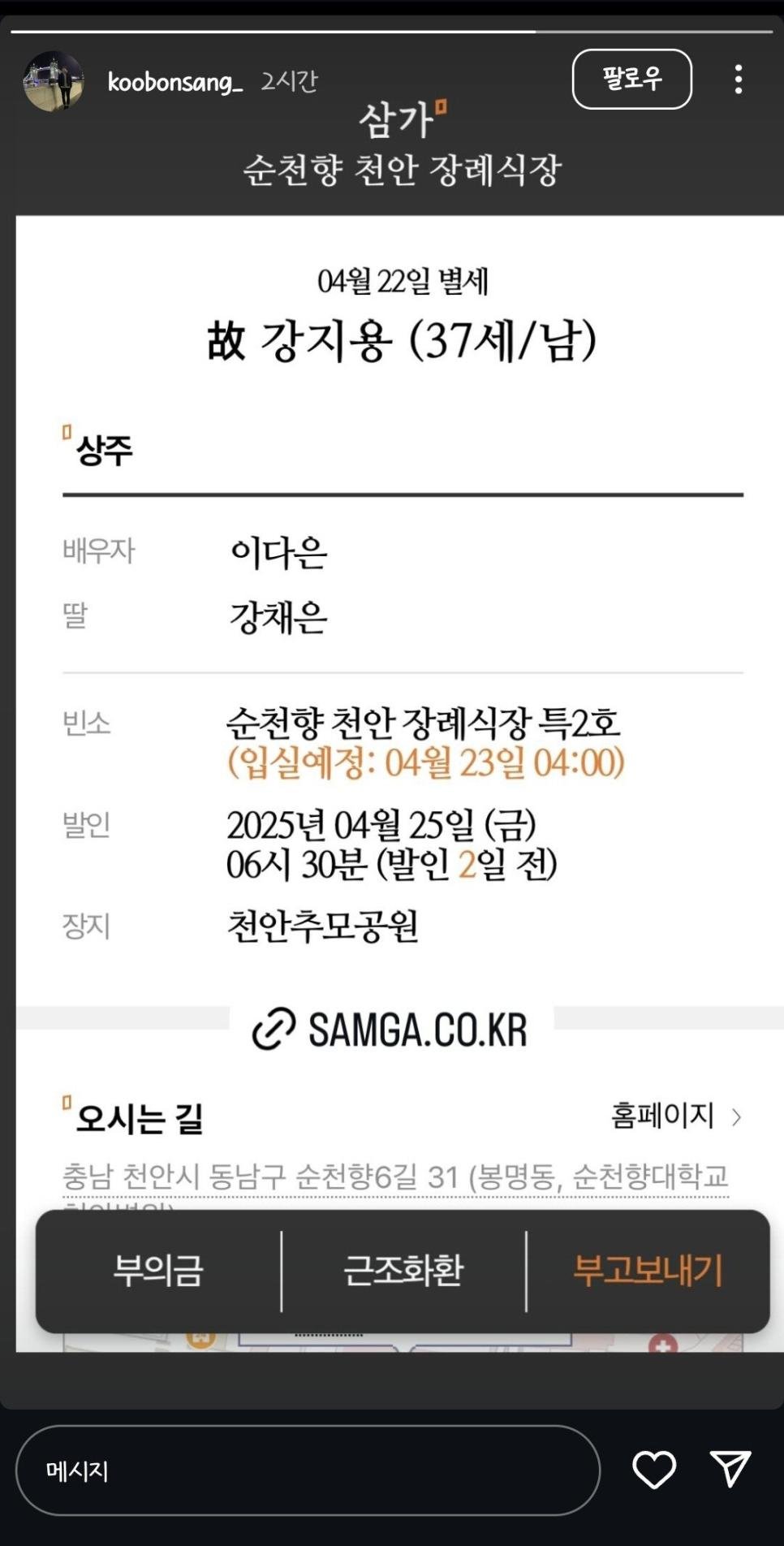 이혼숙려캠프에 출연했던 전 축구선수 강지용 본인상 ㄷㄷㄷ rh1 0 253 0 2025.04.23 11:00 방송에서 남편이 아파트 난간에 메달리는등 자살시도로 부인에게 협박(?)을 하던데, 자살시도를하다 진짜 죽을수 있다는 전문가의 진단도 있었는데 결국엔 이렇게 생을 마감했네요남편이 중심을 못잡고 본가쪽에 끌려다녀 부인을 힘들게 하던데 결국,,,,,방송 내용을 보면 축구선수로 번돈을 부모가 다 챙기고 첫째 사업실패로 자살, 그 부채를 둘째(남편)가 떠안아 빈털터리로 가정이 힘듬,본가와 연을 끊으라는 전문가 조언, 우유부단함이 방송내내 부인을 힘들게 하더니 결국 자살로 생을 마감...남은 부인과 딸이 안타깝네요 쩝,,, 0