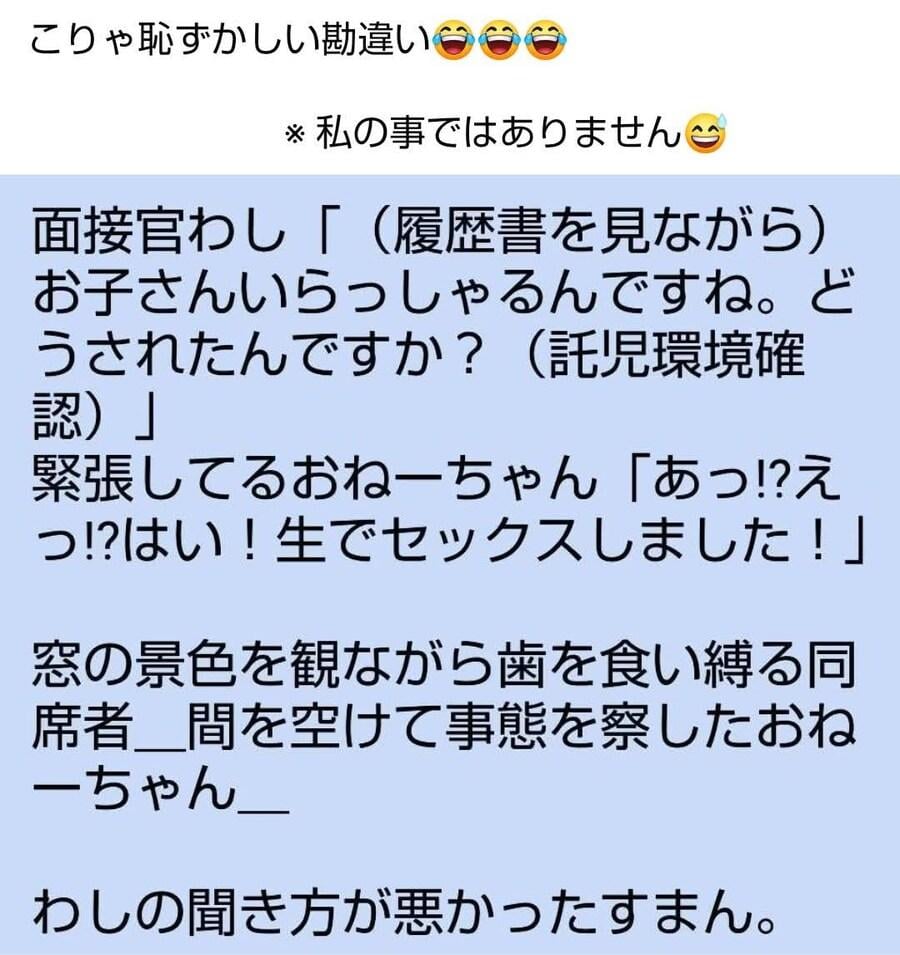 면접관도 모르는 사이에 성희롱 압박면접이 되어버린 썰 rh1 0 181 0 2025.04.23 00:30 면접관: (이력서 보면서) 아이가 있으시네요. 어떻게 하셨어요?(출근 시 아이 어디다 맡기는지 확인)긴장한 여성 면접자 : 앗!? 엣!? 하이! 노콘으로 섹,스했습니다!창밖 풍경을 내다보며 이를 깨무는 동석자.. 시간이 살짝 흐른 후 사태가 파악이 된 면접자...내 질문 방법이 잘못됐구만. 미안 0