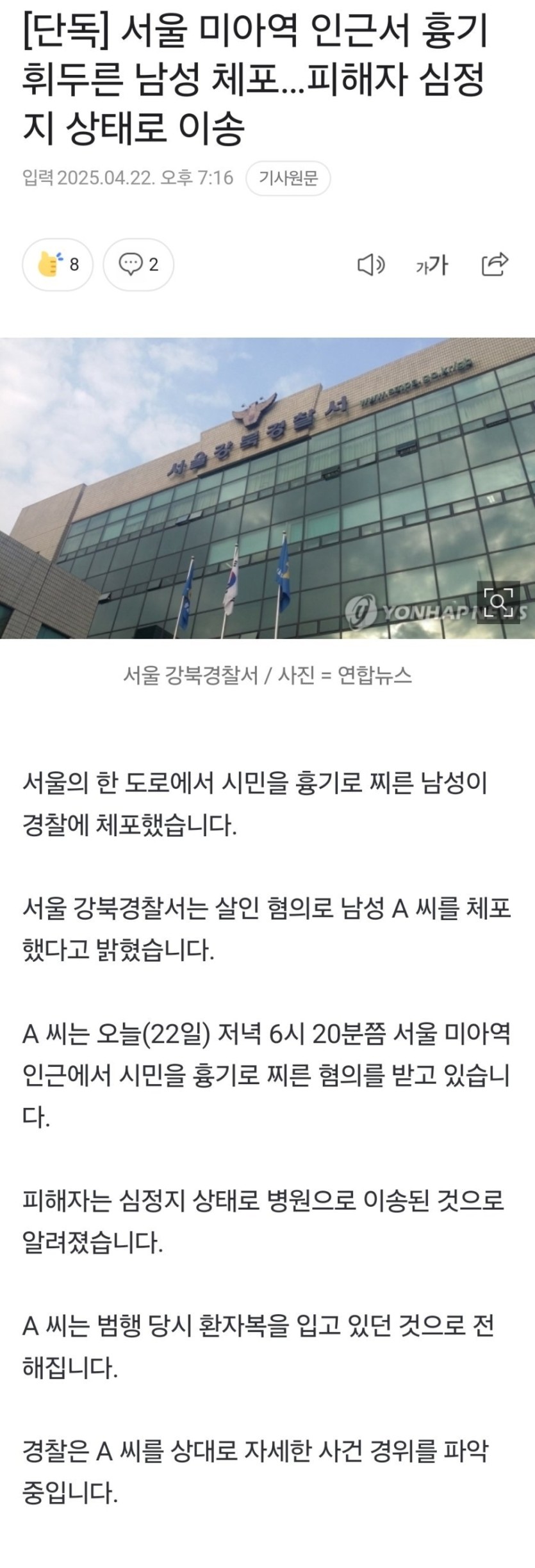 서울 미아역 인근서 흉기 휘두른 남성 체포 rh1 0 95 0 2025.04.23 00:15 날 더워지니 미친것들 출몰하기 시작 ㄷㄷㄷ https://naver.me/xxYDe1DD 서울 미아역 인근서 흉기 휘두른 남성 체포 0