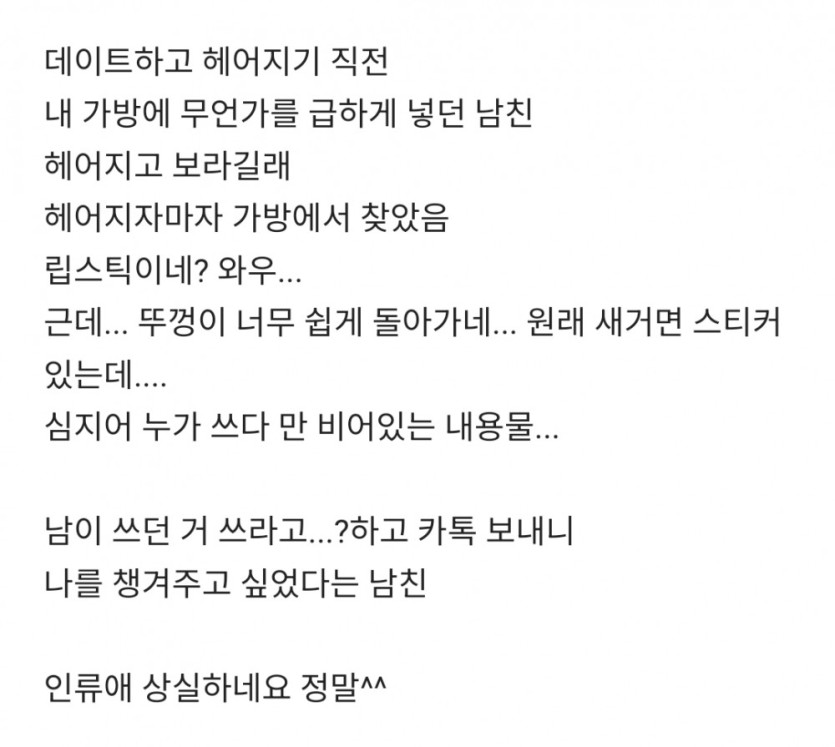 데이트하고 여친 가방에 무언가를 넣어준 남친