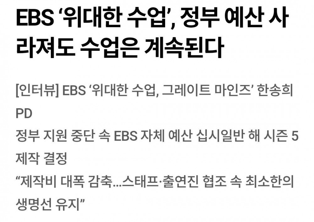 EBS 위대한 수업, 정부 지원 없이 제작한다. rh1 0 107 0 2025.04.22 23:15 국가평생교육진흥원 공모를 통해 선발되어 제작이 시작된 '위대한 수업'인데 정부 지원 중단됨이에 EBS가 결단을 내려서 자체 예산으로 시즌5 제작 결정했다고 함다만, 제작비는 20% 수준에 인력은 22명에서 9명으로 대폭 감소된 상황 EBS 위대한 수업, 정부 지원 없이 제작한다. 0