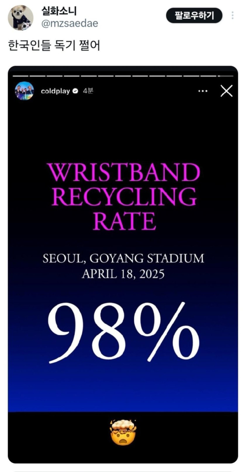 콜드 플레이 콘서트 팔찌 회수율(한일전) rh1 0 95 0 2025.04.22 19:15 콜플 투어 할때 이렇게 빛나는 팔찌를 나눠주는데 원격제어 야광봉처럼 콘서트장 내에서만 반응하는 팔찌임ㅇㅇ이 자일로 밴드라고 하는걸 최대한 재활용해서 사용하기위해 콘서트가 끝나면 회수하고 국가별 반환률도 콘서트장 내에 띄워주고 있다는 사실...!어 일본이 1위야 일본한테 졌어?? 0