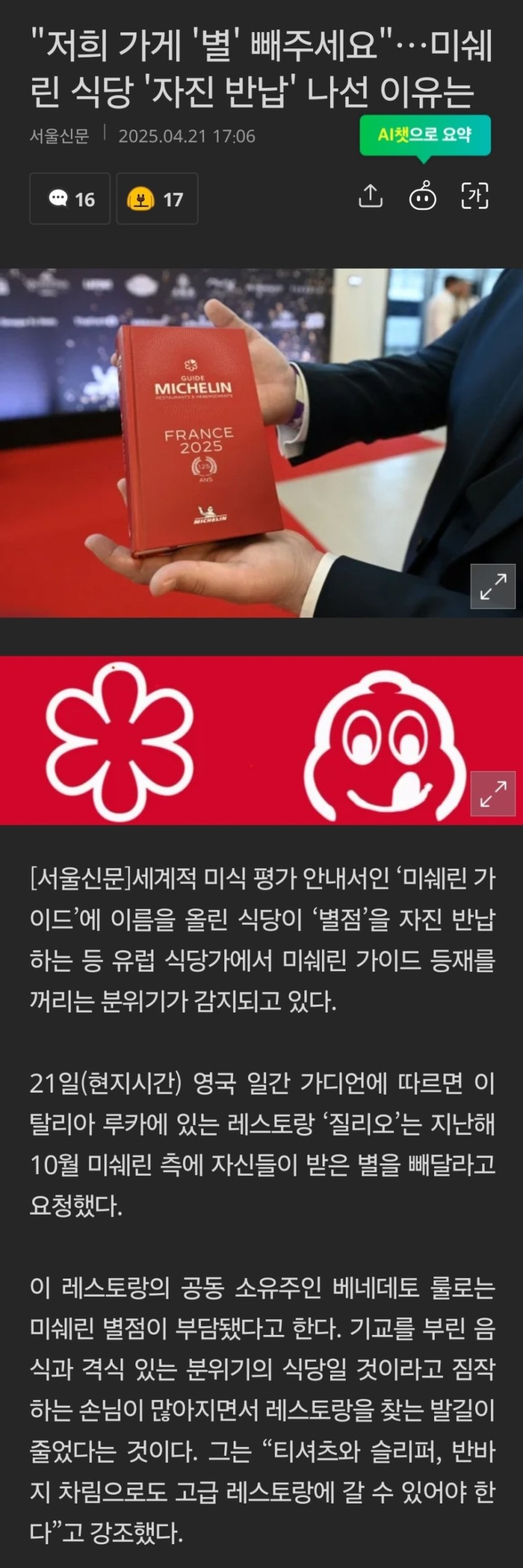 "저희 가게 '별' 빼주세요"…미쉐린 식당 '자진 반납' 이유