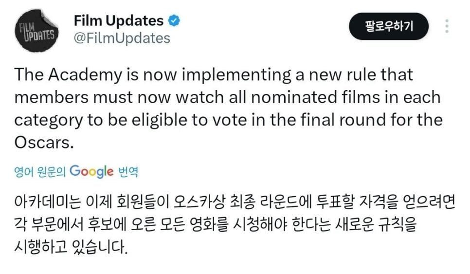 오스카 시상식에 새로 생긴 충격적인 규칙