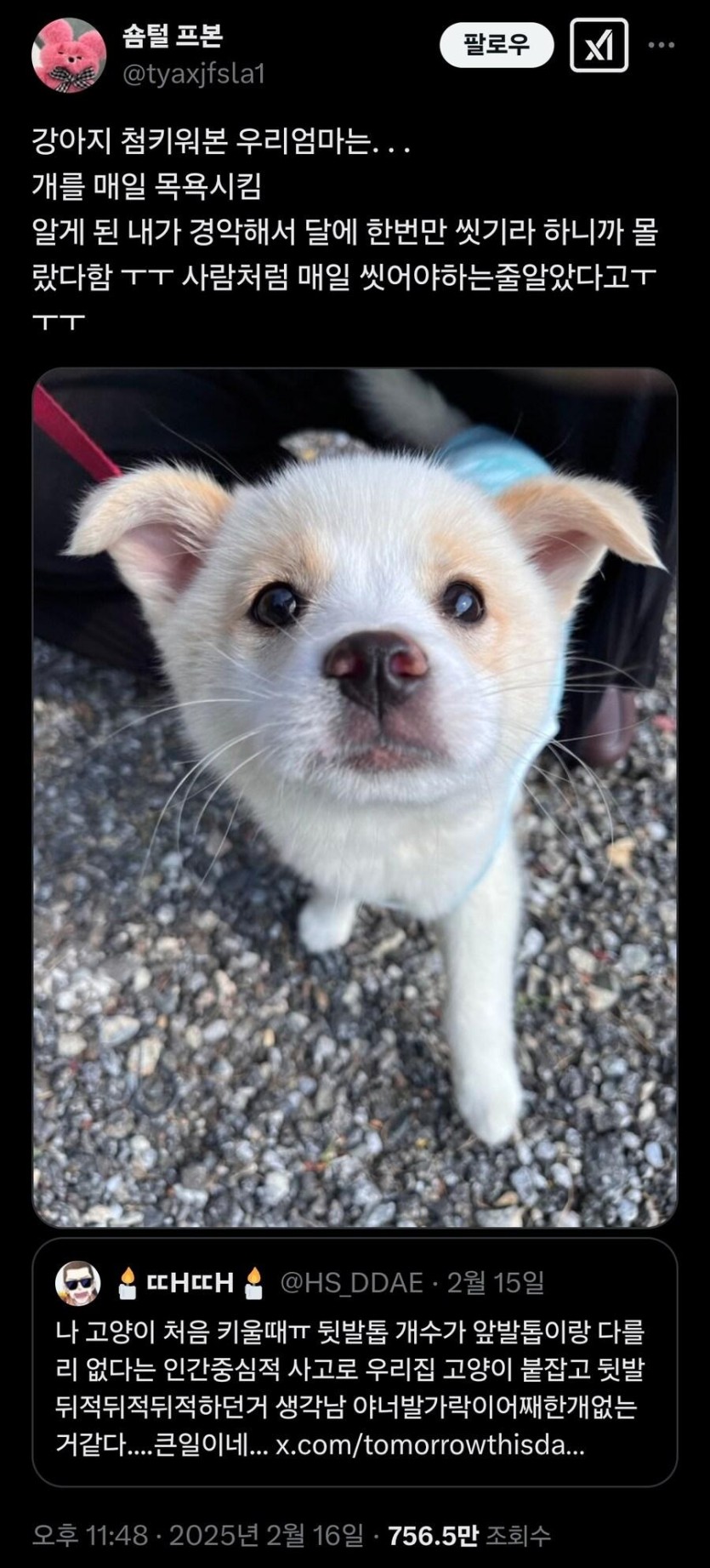 강아지 처음 키워본 엄마가 매일 목욕시킴.