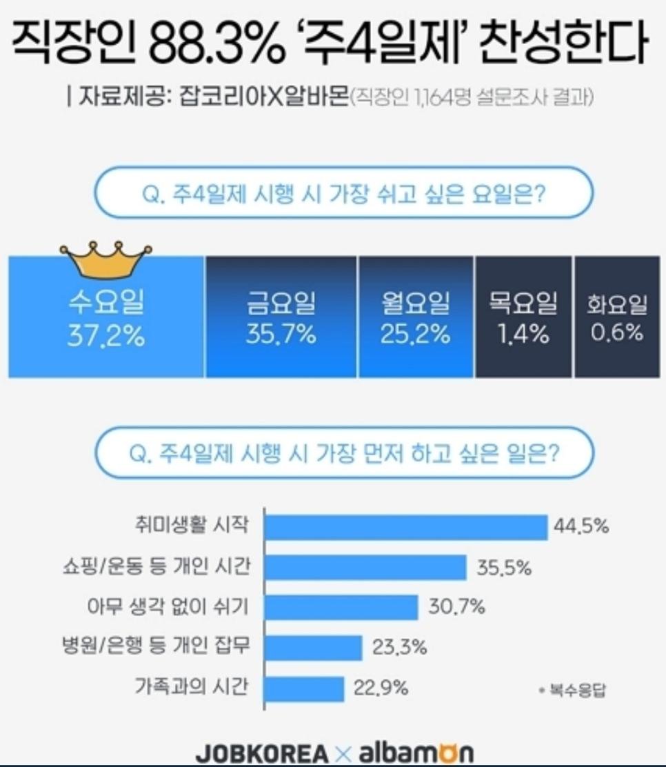 주4일제 한다면 가장 쉬고 싶은 요일은??