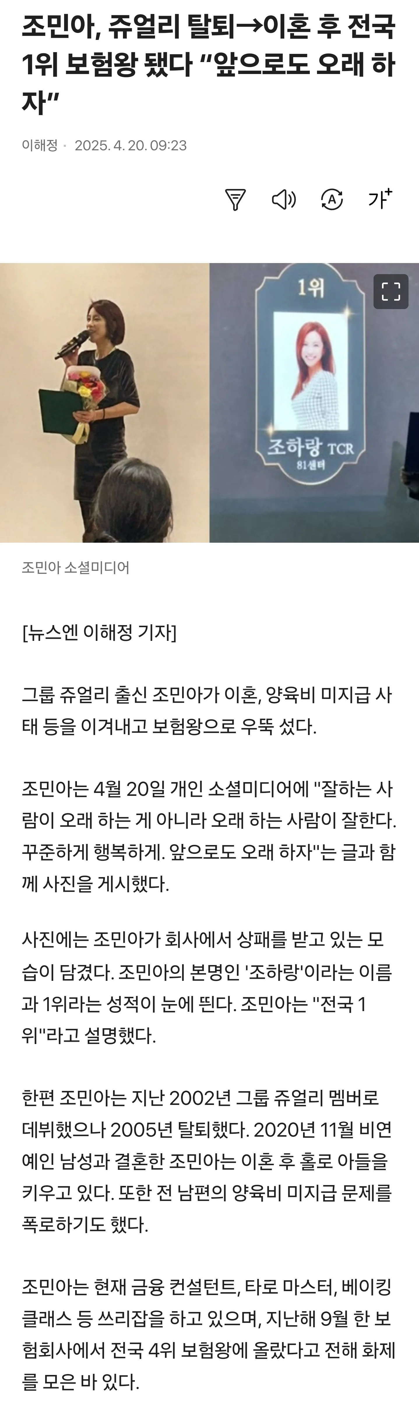 조민아, 쥬얼리 탈퇴→이혼 후 전국 1위 보험왕 됐다