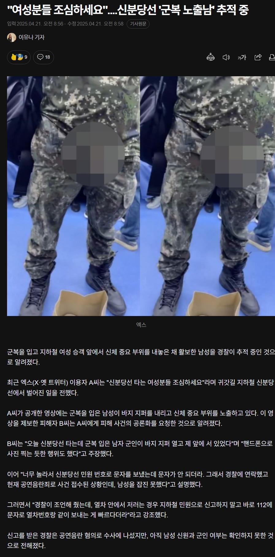 "여성분들 조심하세요"신분당선 '군복 노출남' 추적 중
