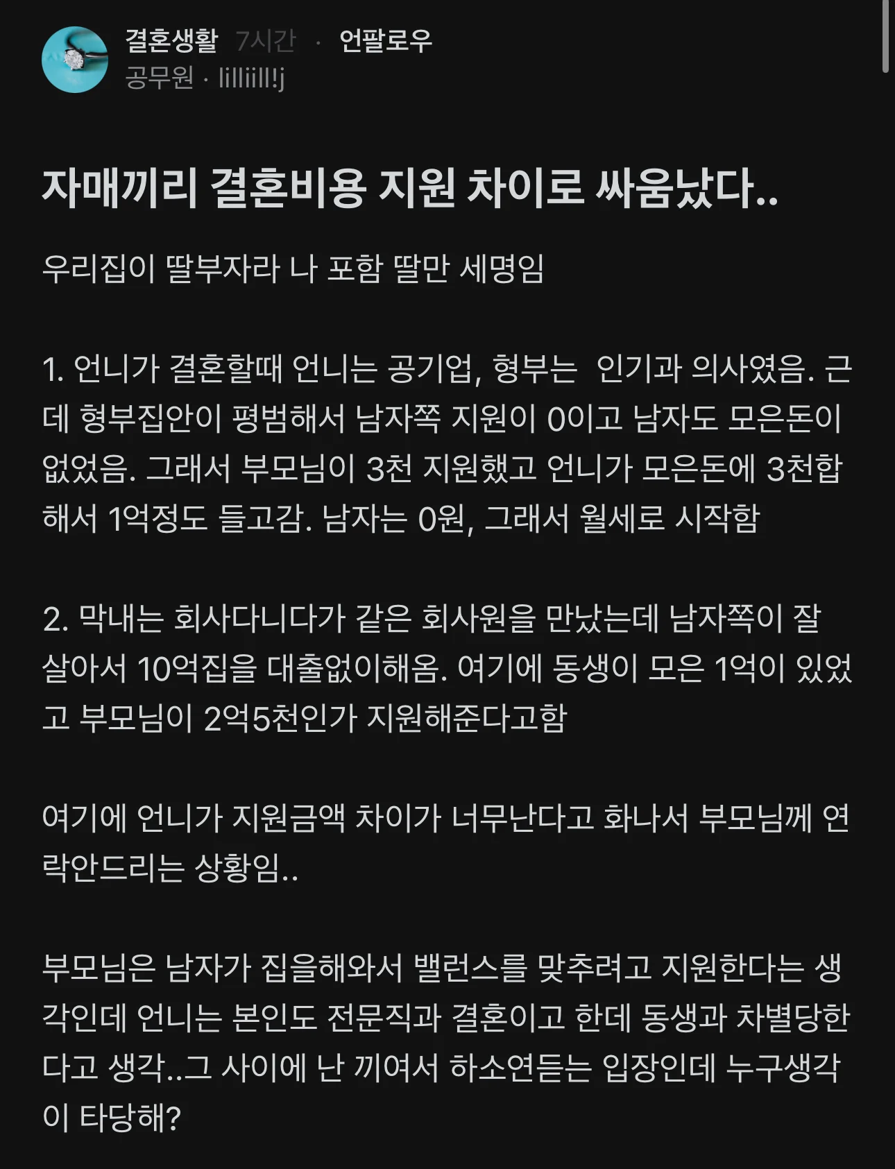 자매끼리 결혼비용 지원 차이로 싸움났다..