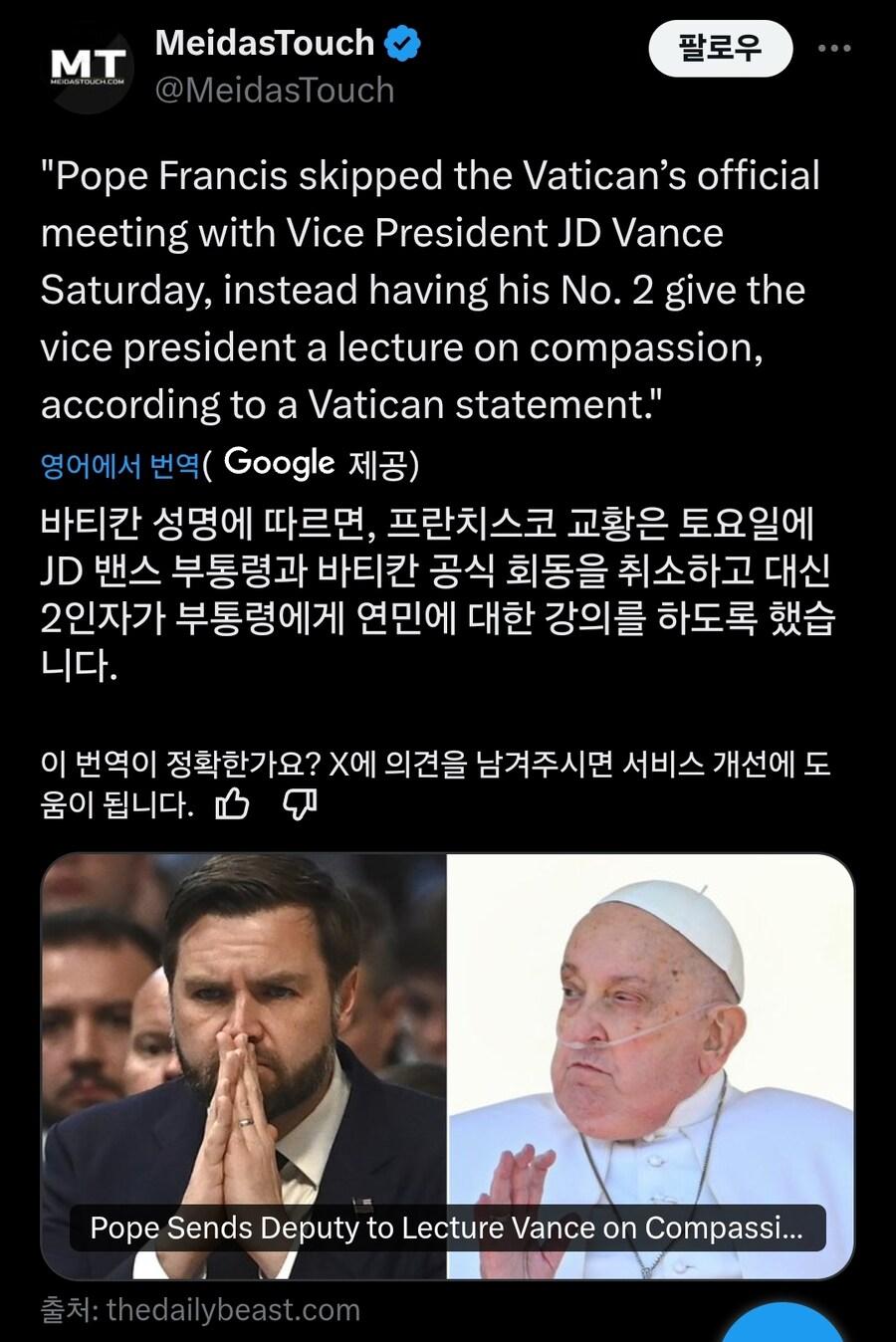 교황이 미국 부통령과의 1대1 면담 취소한 이유
