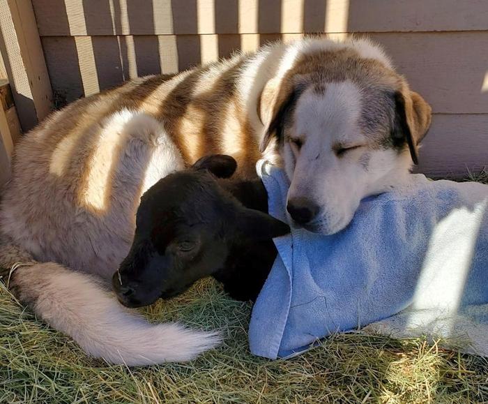 어린 동물을 돌보고 있는 미국 목장견 '부포드'. 길을 잃은 두 살배기 아이의 옆을 지킨 것으로 알려졌다. 사진=스코티 던튼