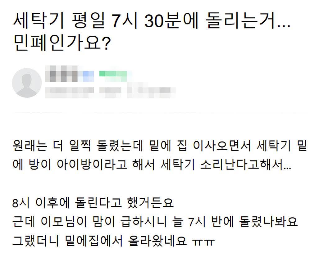 세탁기 평일 아침 7시 30분에 돌리는 거 민폐인가요?