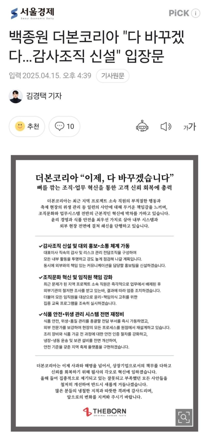 백종원 더본코리아 "다 바꾸겠다…감사조직 신설" 입장문