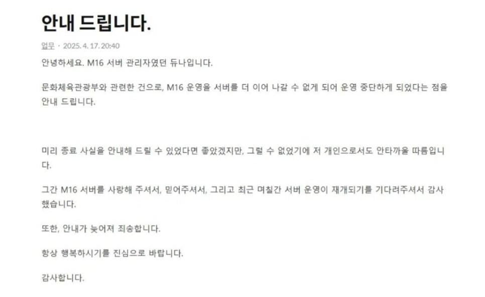 스타 피쉬 서버 처럼 워크 M16 서버도 사망