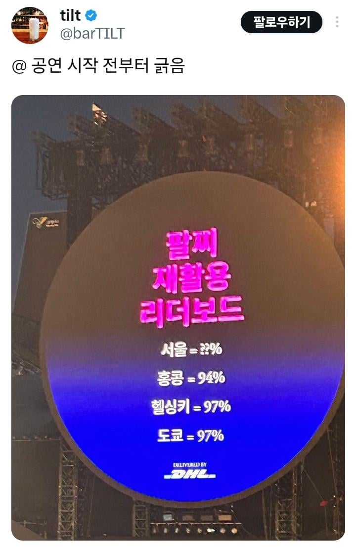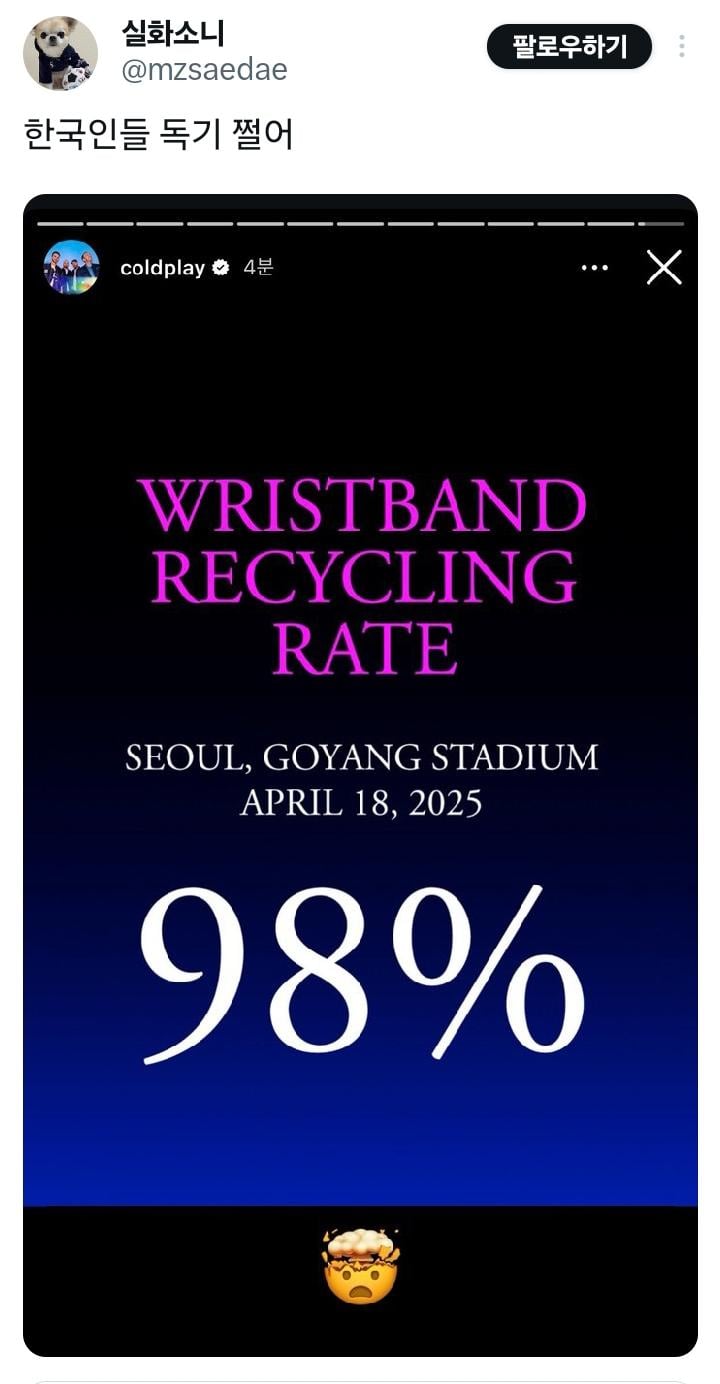 [한일전]콜드 플레이 콘서트 팔찌 회수율 rh1 0 94 0 2025.04.19 22:15 콜플 투어 할때 이렇게 빛나는 팔찌를 나눠주는데 원격제어 야광봉처럼 콘서트장 내에서만 반응하는 팔찌임ㅇㅇ 이 자일로 밴드라고 하는걸 최대한 재활용해서 사용하기위해 콘서트가 끝나면 회수하고 국가별 반환률도 콘서트장 내에 띄워주고 있다는 사실...! 어 일본이 1위야??? 한일전은 못 참지 0