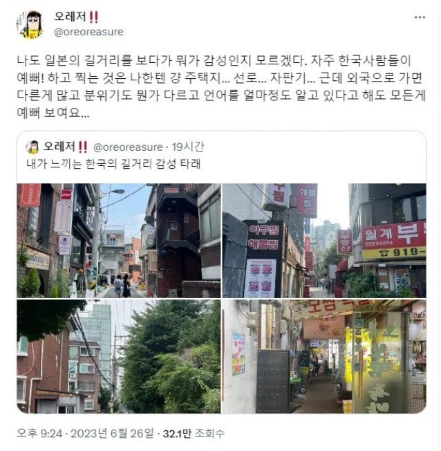 일본인이 보고 너무 예쁘다고 한 한국 길거리 사진 rh1 0 95 0 2025.04.19 23:15 반대로 본인은 한국인들이 일본 길거리 사진 뭐가 이쁘다고 그렇게 찍는지 모르겠다고 함 역시 상대적인건가 일본인이 보고 너무 예쁘다고 한 한국 길거리 사진 0